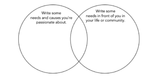 In the middle (overlap) is where your passion meets opportunity—the needs you care about and can prayerfully act on today.